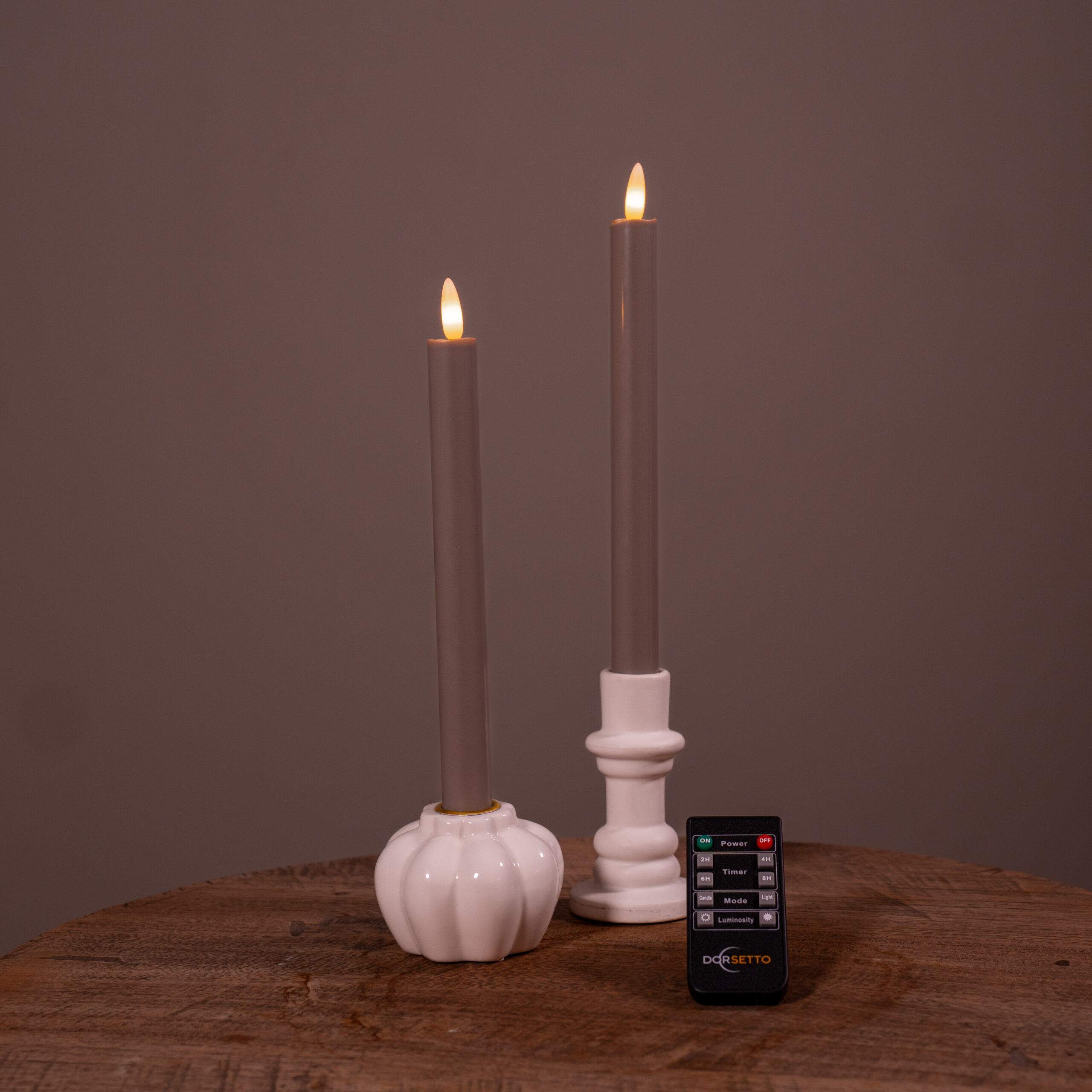 Das Set besteht aus zwei Stabkerzen mit einer Höhe von 250 mm, einer Fernbedienung,