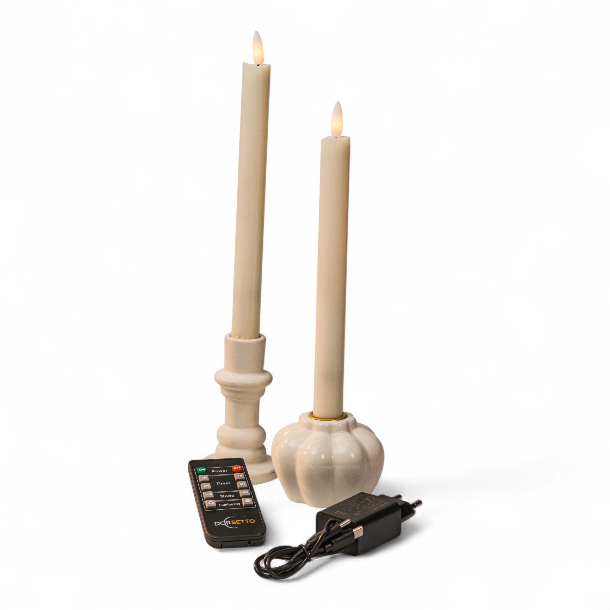 Das Set besteht aus zwei Stabkerzen mit einer Höhe von 250 mm, einer Fernbedienung, einem USB-Ladekabel,
