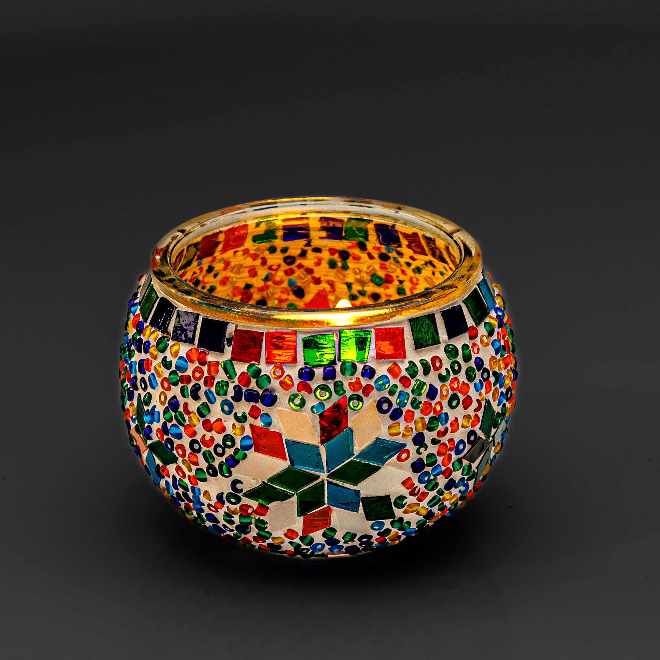 Stellen Sie ein Teelicht in den Halter, und das warme Licht scheint gemütlich durch das farbenfrohe Mosaik – ideal für eine angenehme Atmosphäre.